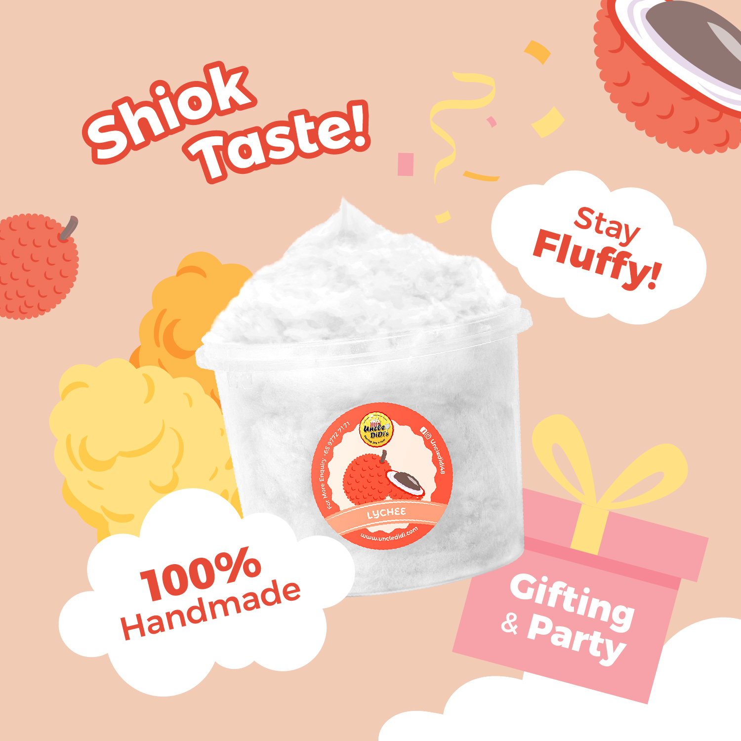 Lai, lai! Come try our Lychee Cotton Candy! We know you all love the flavour of lychee mah, so we make cotton candy out of it lah! Cannot miss this hor! Sweet with a bit of tarty flavour – shiok ah!